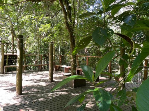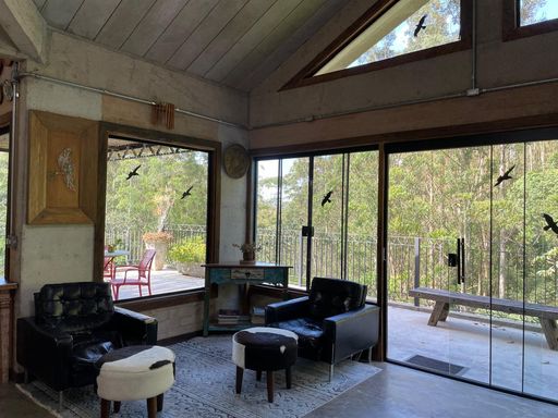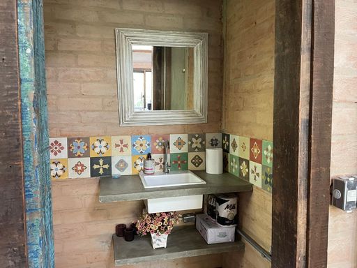 Na área externa um jardim ornamental com arvores frutificas , decks com balanço redário para descanso um belo fogo de chão para dias frios