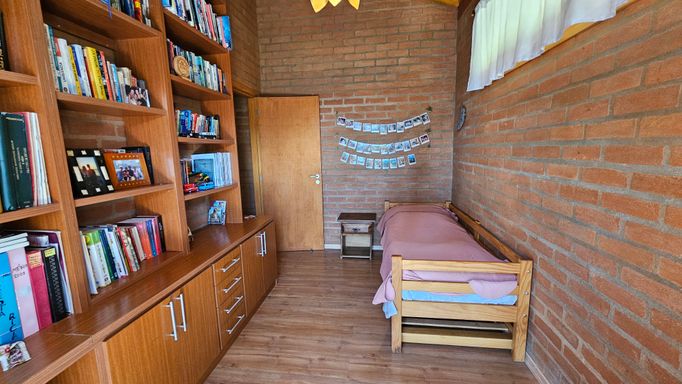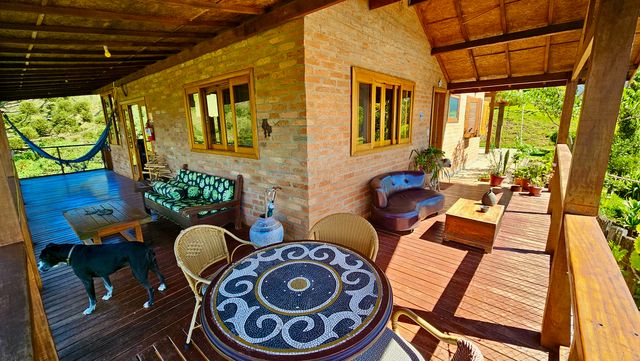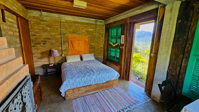 Construída com uma bela estrutura de concreto e com acabamento rústico com tijolos grandes de barro aparente, esta casa traz um ambiente acolhedor e tranquilo e conta também com um excelente conforto
